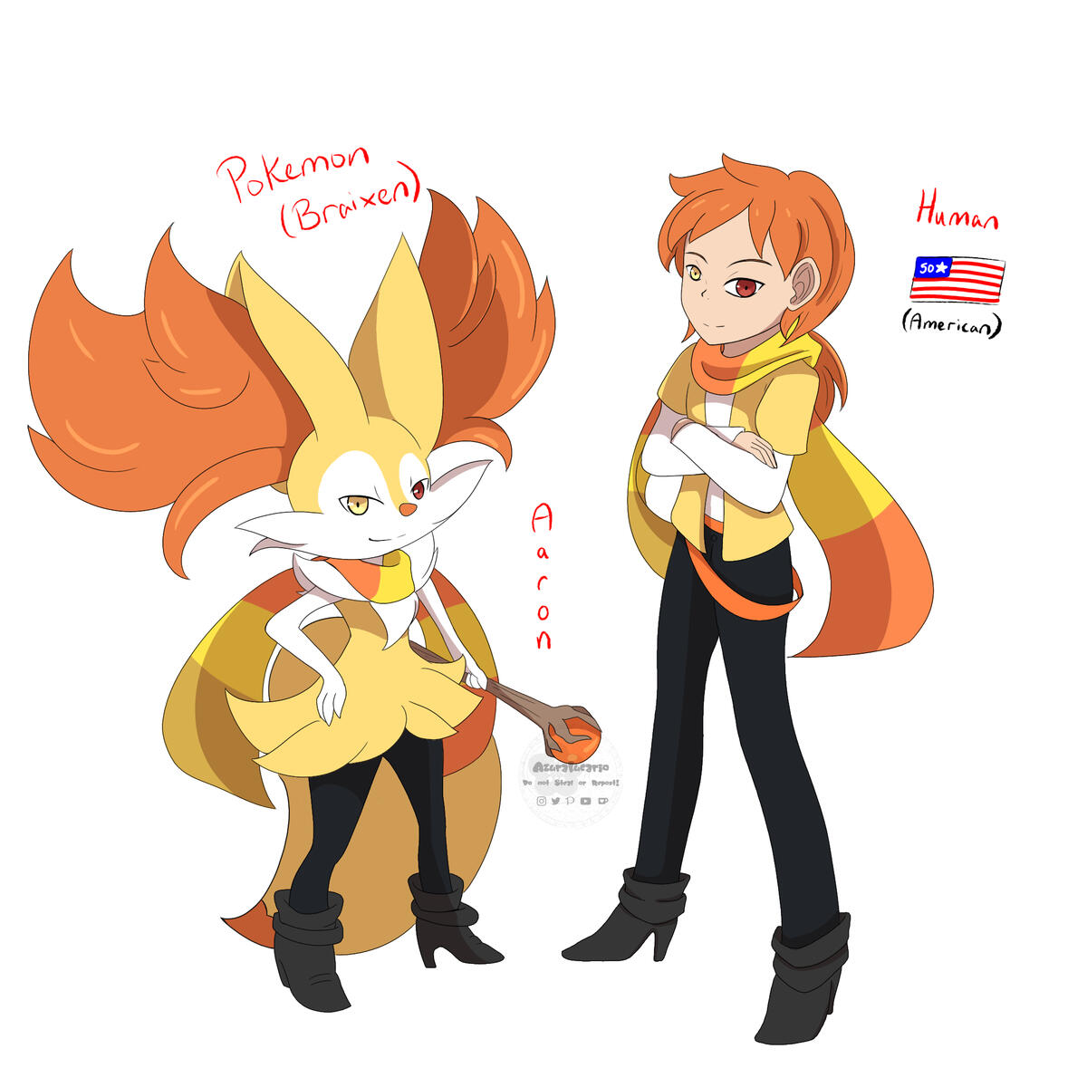 Aaron is a Braixen, but a special kind, who never was a Fennekin and will never evolve to a Delphox. In addition, his egg group is classified as unknown. The reason being: he was created solely by Arceus, which makes his DNA complex. This would make the Creation Trio (Dialga, Palkia and Giratina) his siblings. Thanks to that, he is an extremely strong Pokémon. Despite being Fire-type, Aaron can use moves and attacks all types, such as water, grass, psychic and so on. Another key point of Aaron is his boots, which prevents him from removing them. One attempt on removing them and he’s electrocuted. He is also the husband of Mary-Belle, the Noivern, and brother-in-law to [Belle’s younger brother] Mason.