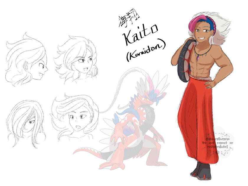 Siding with Evolet, Kaito is known as the Ancient Legendary Pokemon. He is known to be cocky and proud of his own physical appearance and strength, but rather gluttonous. However, he does have a caring side to those he holds dear, the Future Legendary Pokemon included. He can take on both human and Pokemon form, according to headcanon.