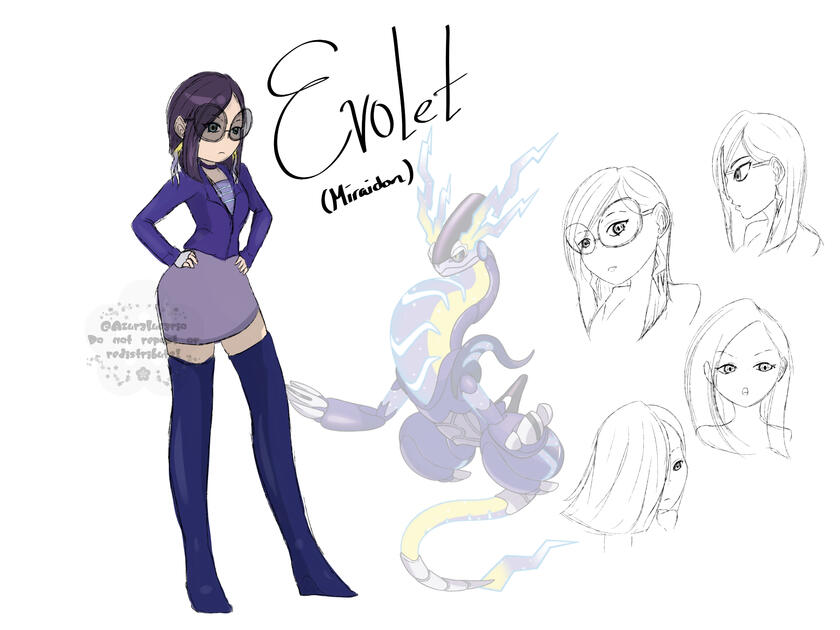 Siding with Kaito, Evolet is known as the Future Legendary Pokemon. She is strict yet reasonable during her battles. She loves food, but she is not at all as glutton as Kaito is, to which she scolds him, for the sake of trying to help him focus. She can take on both human and Pokemon form, according to headcanon.